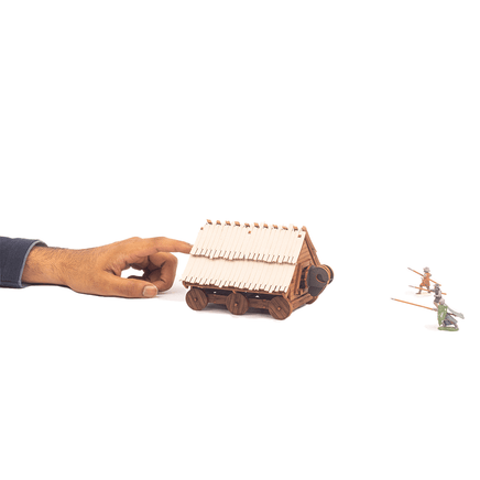 The Battering Ram was the medieval equivalent of the modern bulldozer. A massive timber, capped with a ram’s head formed the battering element. This was mounted onto a cart that had a sloped roof to provide the attackers some means of defense against arrows and falling rocks thrown from the castle battlements. This model features an openable roof allowing you to observe the spring-loaded mechanism and trigger on the inside. Push the head back till it locks, depress the trigger to launch the Ram head forward. This kit allows you to build a replica of a medieval battering ram. The roof of the ram is made up of roughly cut timber planks that offered protection from enemy arrows and stones thrown from their ramparts. In medieval times, the wooden planks would usually be covered with animal hide to provide some protection against fire arrows. In this kit, the roof is openable allowing the user to view the parts inside. In this kit, the motion of the ram is simulated through a spring-loaded mechanism. Push the ram head back until it clicks against the firing trigger. Press the firing trigger down to release the ram.