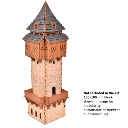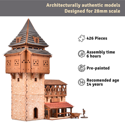 The Eyrie is a fortified medieval guard tower built in Ashlar stone masonry on the lower levels and timber upper levels. The model features precision-cut parts and realistic material finishes. Openable windows, doors, and side panels have been provided. Each floor is detachable to allow easy access to the interiors. Provision to install lights has been provided on each floor. Detailed truss work and roofing shingles have been provided. One free modular wall unit has been provided along with the Eyrie kit. The Eyrie towers over the surrounding landscape affording a clear view of the countryside. The Eyrie is a guard tower designed to provide defenders with a protected elevated position from which they detect and engage attackers. These guard towers were usually placed within arrow range of each other along the perimeter of the castle walls to ensure there were no blind spots in the castle defenses. Attackers would find it difficult to mount a sneak attack, a prolonged siege would be the only option.